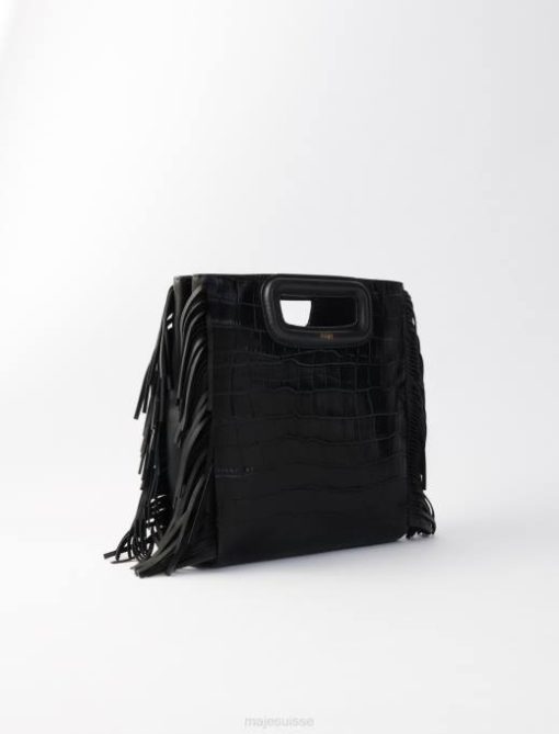 Sac m iconique de maje en cuir embossé effet crocodile. franges, une anse gainée, surpiqûre centrale, logo doré embossé, signature gravée sur les mousquetons. fermeture par languette magnétique. portez-le à l’épaule, à la main ou en bandoulière grâce à la bandoulière en cuir réglable.