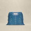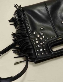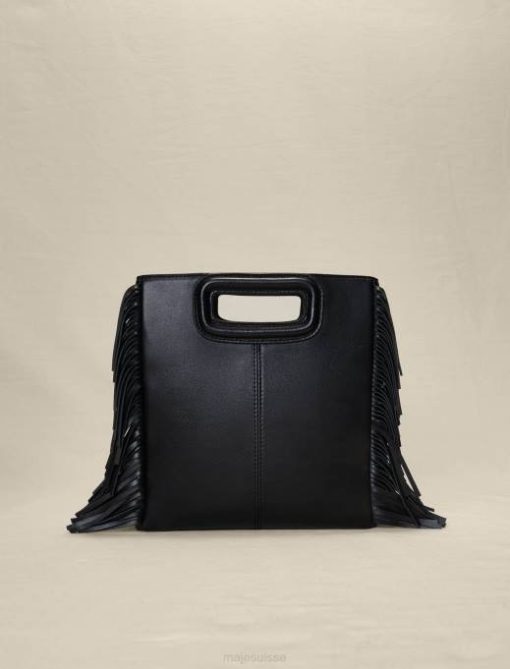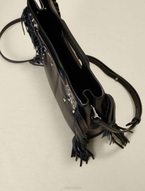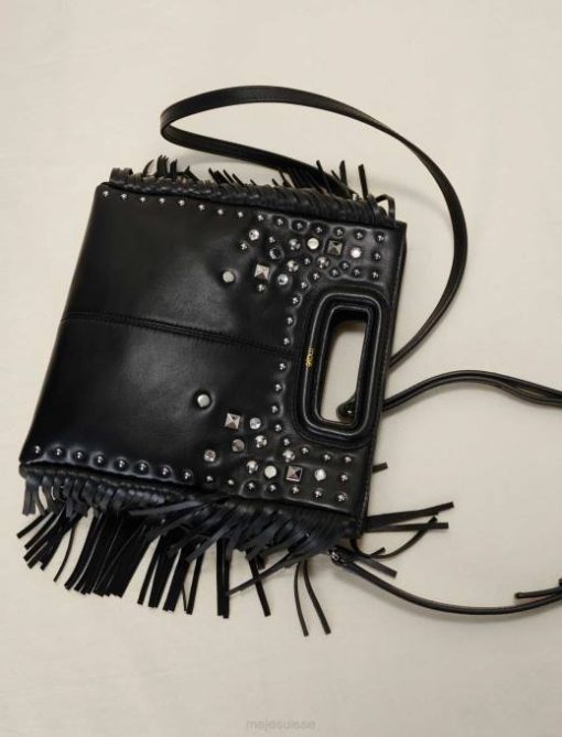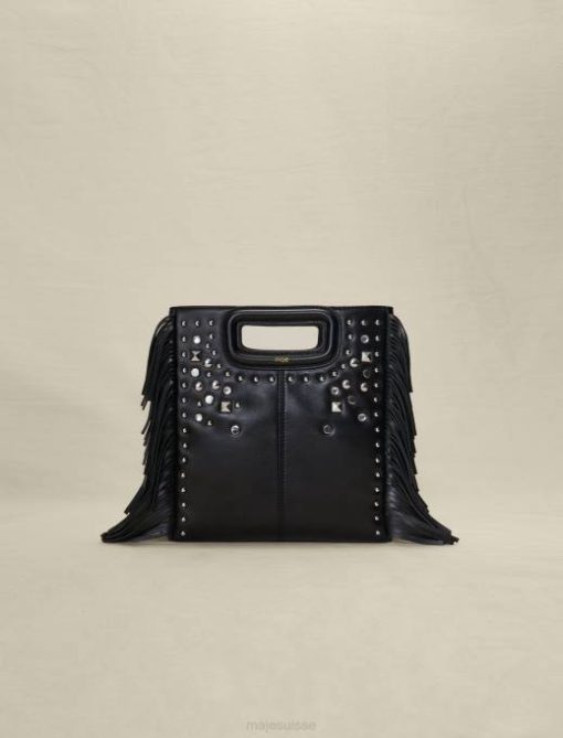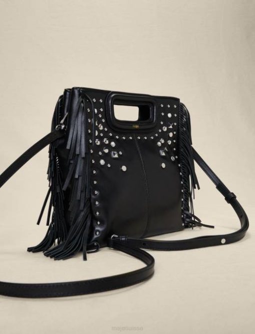cette saison, le sac m iconique de Maje se décline dans une version noire cloutée. agrémenté de franges sur les côtés et doté d’une anse gainée, il présente un logo doré embossé et une signature gravée sur les mousquetons. en plus de sa pratique fermeture aimantée, il possède une bandoulière réglable et amovible vous permettant de le porter de différentes manières : à la main, en bandoulière ou en bandoulière.