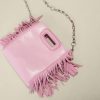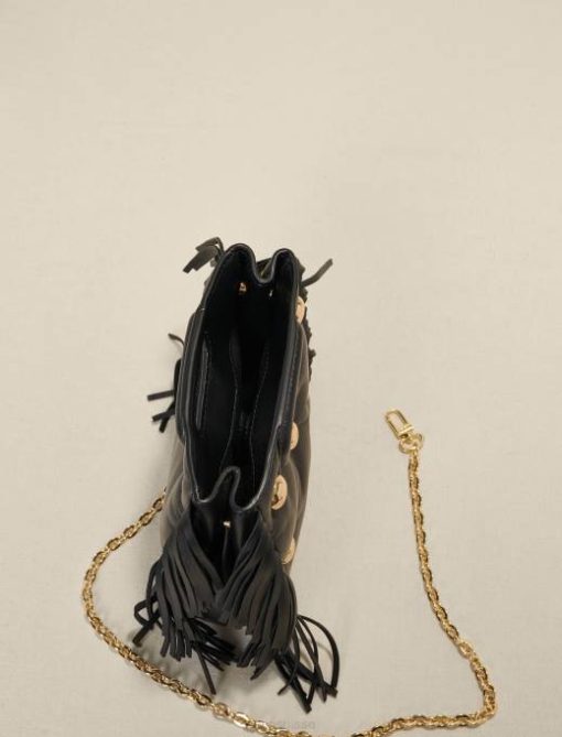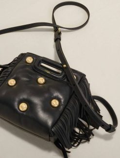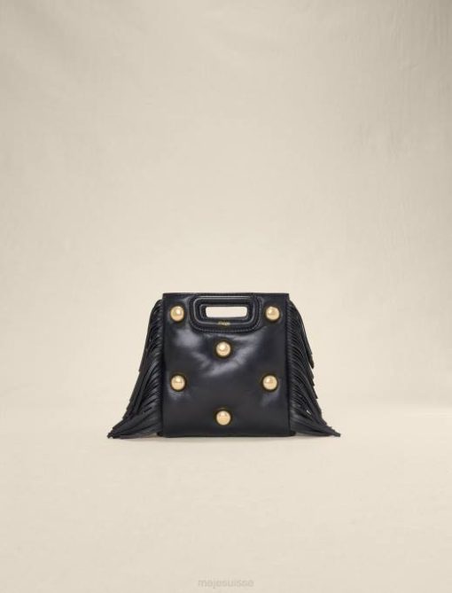 ce sac mini m en cuir matelassé adopte le cuir noir et les clous. franges, anse moulée, logo doré embossé, signature maje embossée sur l’anse et gravée sur les mousquetons. il peut être porté à la main ou en bandoulière grâce à sa bandoulière en cuir réglable, ainsi que sa longue chaîne dorée.