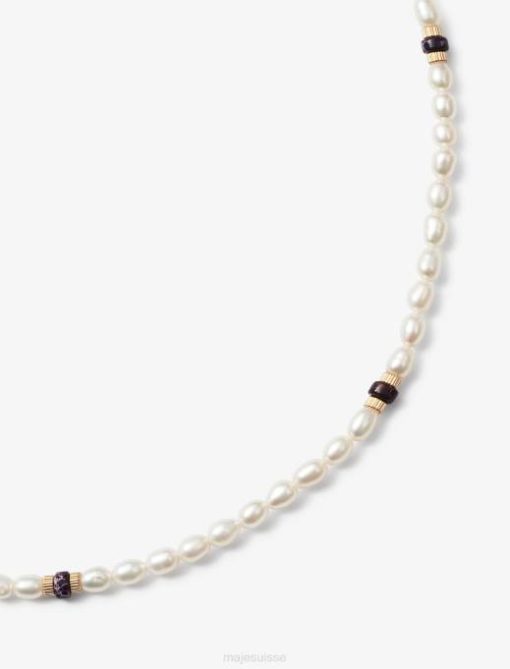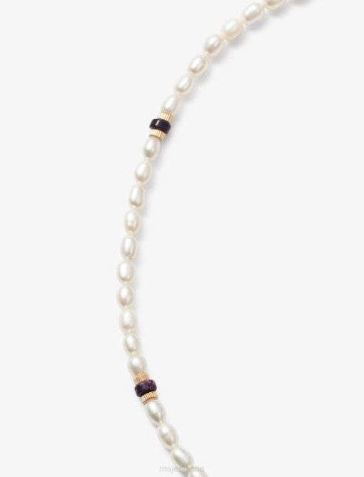 à l’occasion de la nouvelle capsule ”tropical purple”, maje et eliou ont imaginé une collection de bijoux sur mesure pour habiller et twister les looks incontournables de la saison.une collaboration exclusive inspirée des longues journées d’été et saupoudrée d’une touche ludique.chaque pièce de la collection est unique, fabriquée à la main à Miami, et reflète la vision des designers d’Eliou : concevoir des pièces artisanales qui racontent une histoire et que chacun peut s’approprier à sa manière. Orné de perles de nacre et agrémenté de petites perles colorées, ce collier court tendance est une touche finale de caractère à vos looks estivaux. doté d’un fermoir en plaqué or estampillé du « e » d’Eliou, il est parfait porté avec le deuxième collier issu de cette collaboration exclusive. pour un total look ”violet tropical”, portez le collier avec la robe bandana ou l’ensemble haut et pantalon en maille.