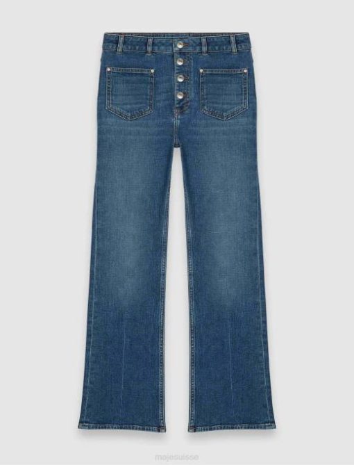 Jean coupe droite, légèrement évasé dans le bas. tissu denim légèrement délavé, effiloché en bas. poches arrière et poches plaquées devant avec rivets métalliques trèfle majesté. boutons métalliques visibles devant avec logo maje. étiquette trèfle maje. peut être porté avec les t-shirts de cette saison.