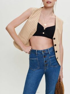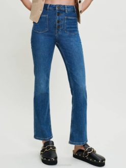 Jean taille haute d’un bleu légèrement délavé, fermé par quatre gros boutons. style évasé et grandes poches avant.