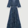 longue robe asymétrique flottante en boite avec volants. manches courtes amples. entièrement doublé en viscose sur le buste et la jupe. col en V. smocké à la taille.