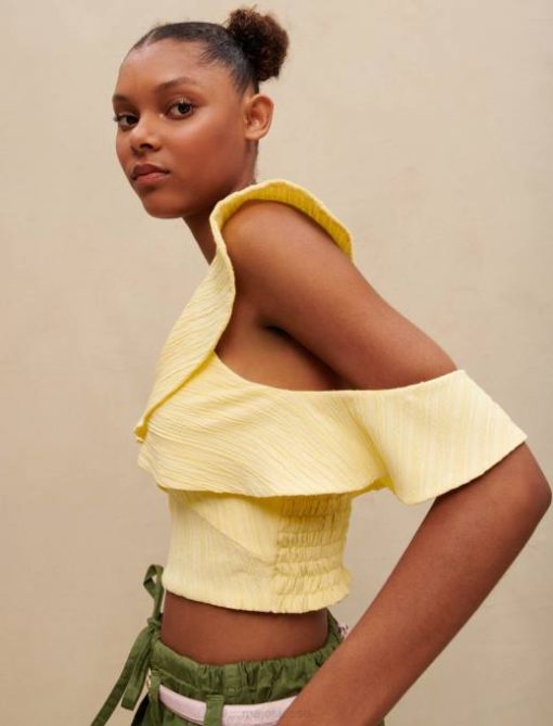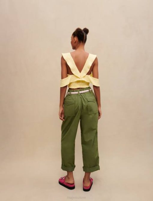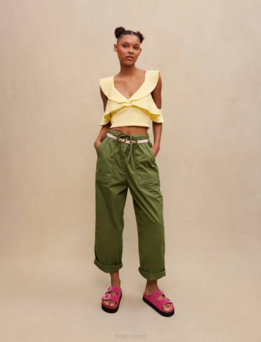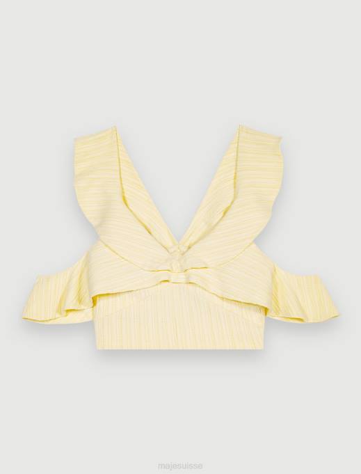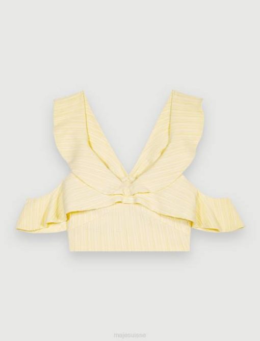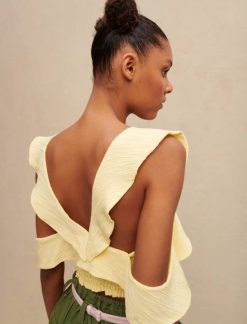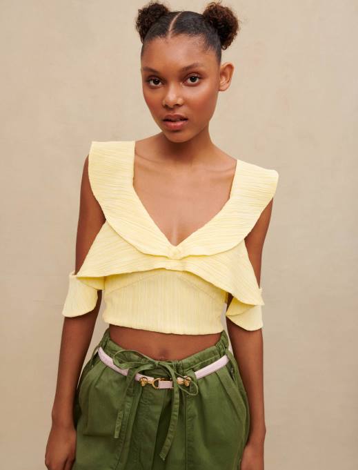 La capsule Miss Sunset de Maje célèbre la saison estivale avec des looks audacieux et colorés, parfaits pour la plage en journée ou les soirées d’été. des pièces voyantes et polyvalentes qui peuvent être portées en total look ou mélangées et assorties. Ce crop-top confectionné dans un tissu crêpe d’une teinte jaune vif présente un joli jeu de volumes pour des silhouettes estivales stylées. Avec un dos smocké et une taille ajustée, ses manches à double volants ont un design découpé qui révèle la peau et crée une silhouette légère et aérée. avec son décolleté en V devant et dos, il crée une allure résolument élégante et affirmée. pour un look estival chic et sans effort, associez-le à un pantalon cargo large associé à une ceinture fine et une paire de sandales à clous de strass dans une teinte acidulée.