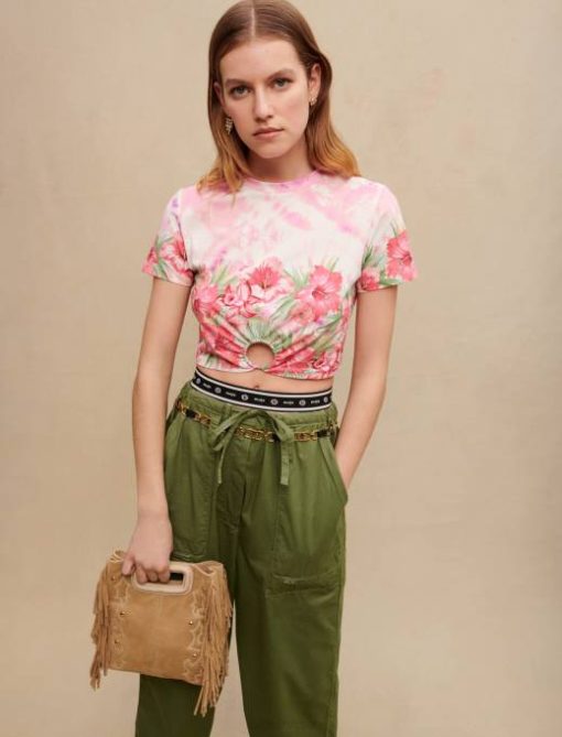 la fleur phare de la saison se dévoile sur ce t-shirt imprimé. Véritable invitation au voyage, l’hibiscus nous transporte dans ce crop top muni d’un anneau et délicatement drapé devant. adoptez cet imprimé en total look, ou associez-le à un short en jean.