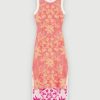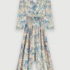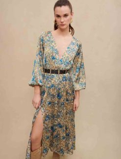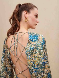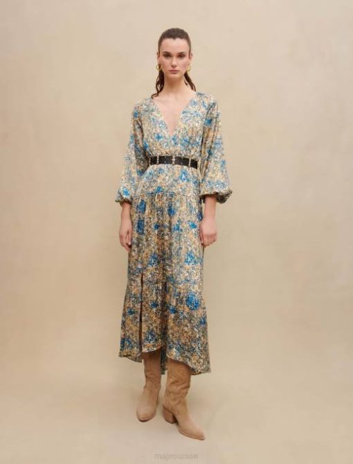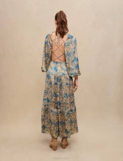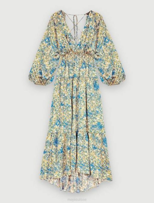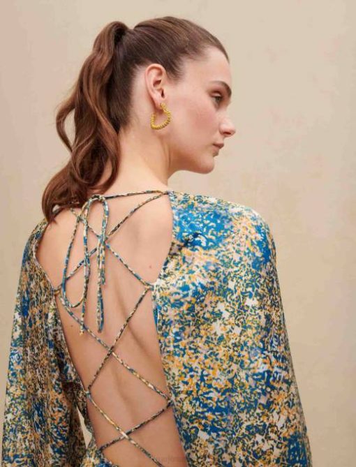 pour la nouvelle saison, maje crée des robes légères et aériennes pour des looks inoubliables. cette robe longue est ajustée à la taille et présente un décolleté plongeant, un dos nu croisé, des manches longues et un imprimé abstrait.