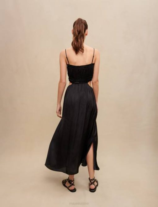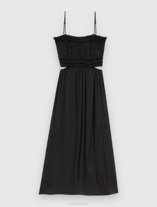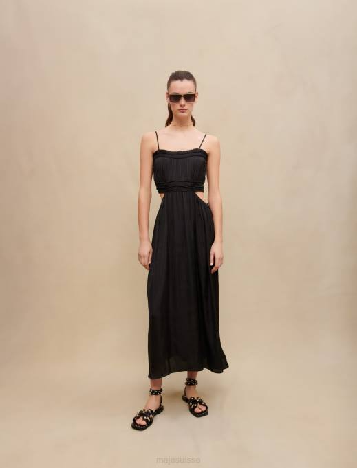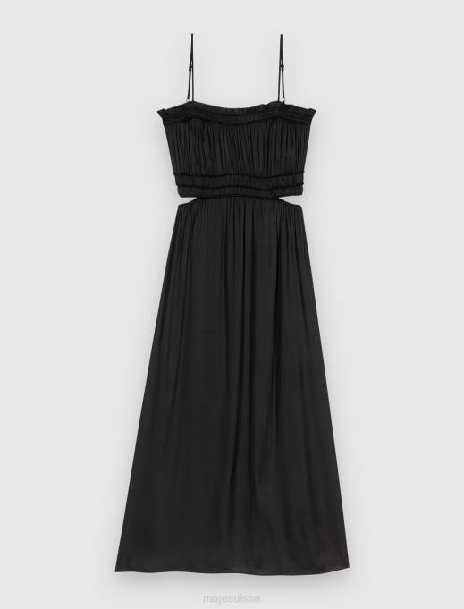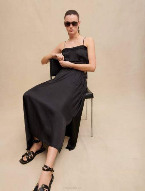cette robe longue plissée satinée promet un look stylé. Maje propose pour cette nouvelle saison une version élégante de la petite robe noire : des découpes légères et délicates sur les côtés, de fines bretelles et un dos smocké.