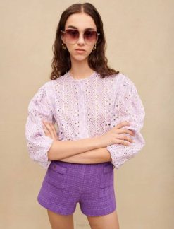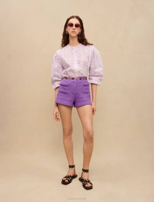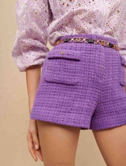 maje a donné au short classique en tweed une refonte moderne et intemporelle en lilas pastel avec des poches ornées de boutons élaborés. ils peuvent être portés avec la veste assortie ou un t-shirt en coton.