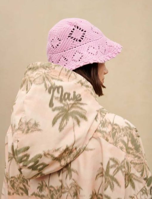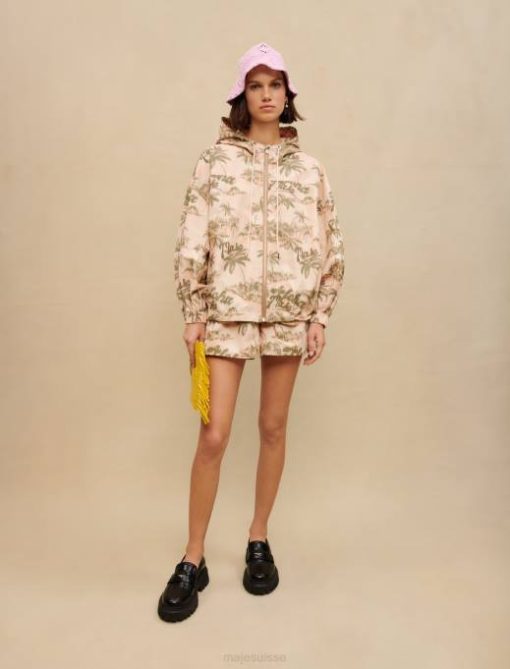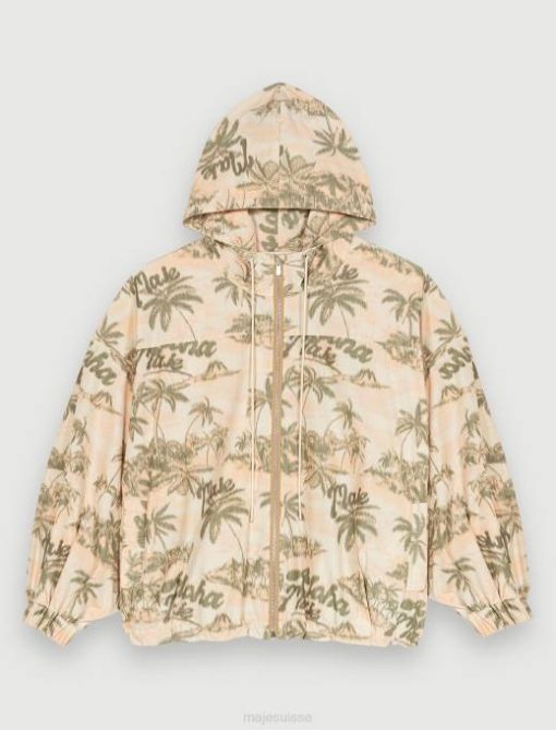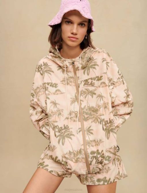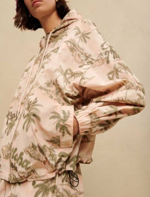 cette saison, maje réactualise le motif palmier hawaïen en l’entourant d’un imprimé all-over « aloha ». cette veste à capuche avec fermeture zippée est légèrement oversize et ses manches longues se terminent par des poignets.