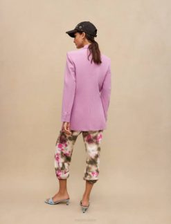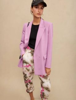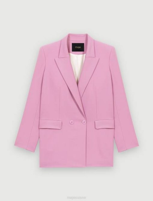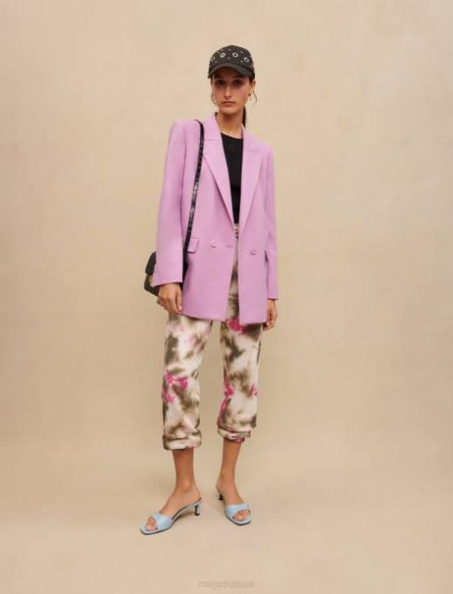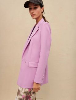 maje a relooké le costume homme en mauve. ce modèle oversize présente des manches longues et une fermeture boutonnée à double boutonnage. il peut être porté en ensemble coordonné avec le pantalon assorti.