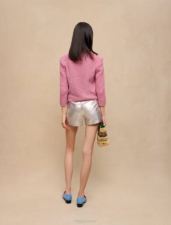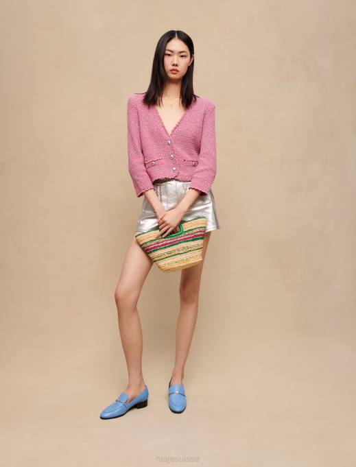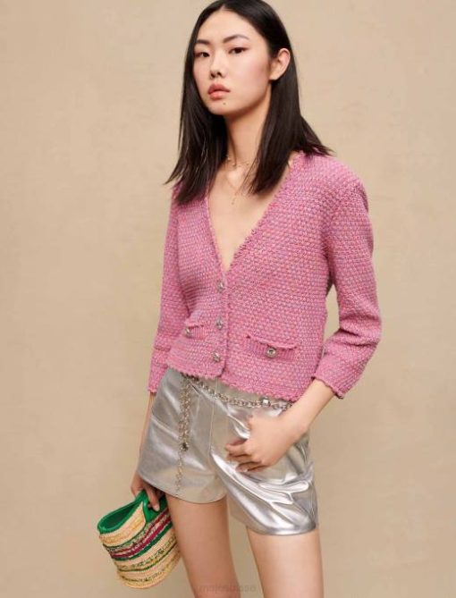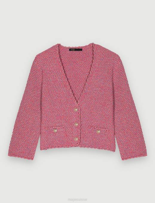 le rose joyeux et pétillant est une couleur phare de la nouvelle collection de Maje. ce cardigan en maille effet tweed peut être porté en total look avec le haut et la jupe assortis, ou simplement associé à un denim pour un look plus décontracté. orné de boutons élaborés, il présente un décolleté plongeant et des manches trois-quarts.
