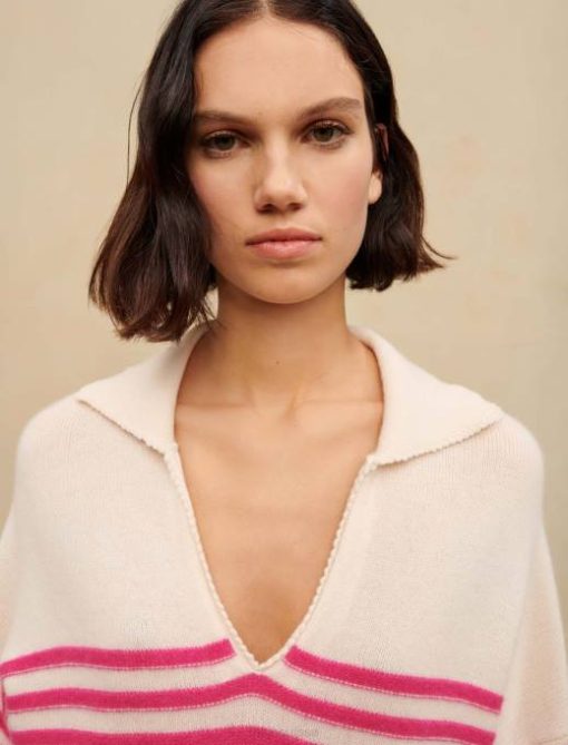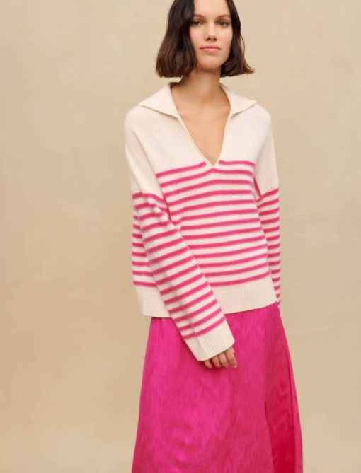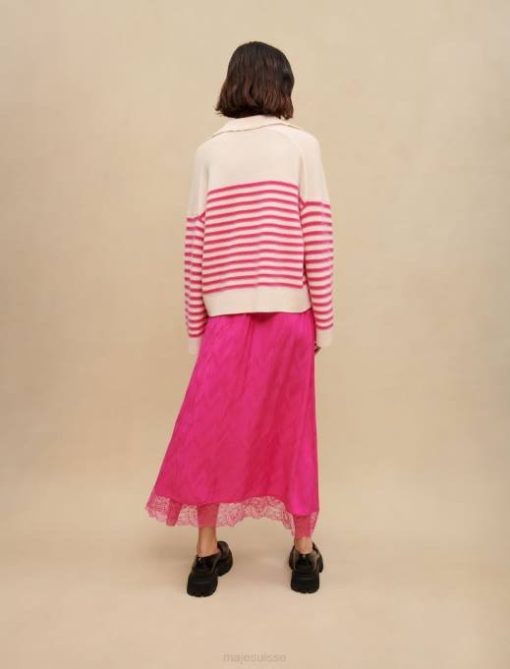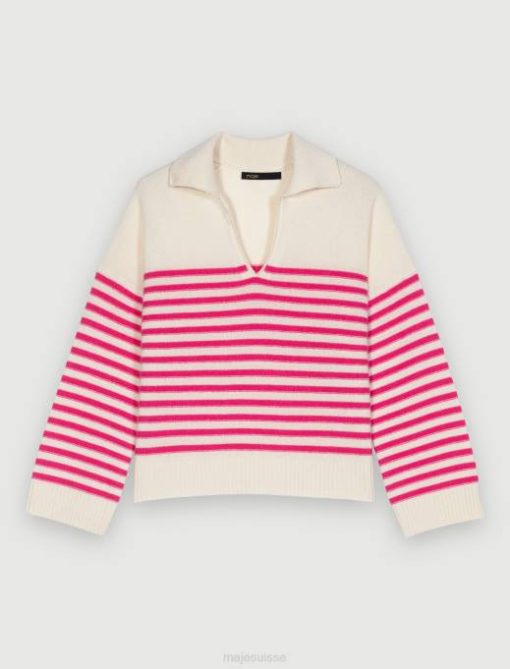 maje revisite la marinière avec la couleur phare de cette saison, le rose. ce pull à manches longues avec encolure en V et col ouvert présente un motif rayé et s’associera avec votre denim préféré.