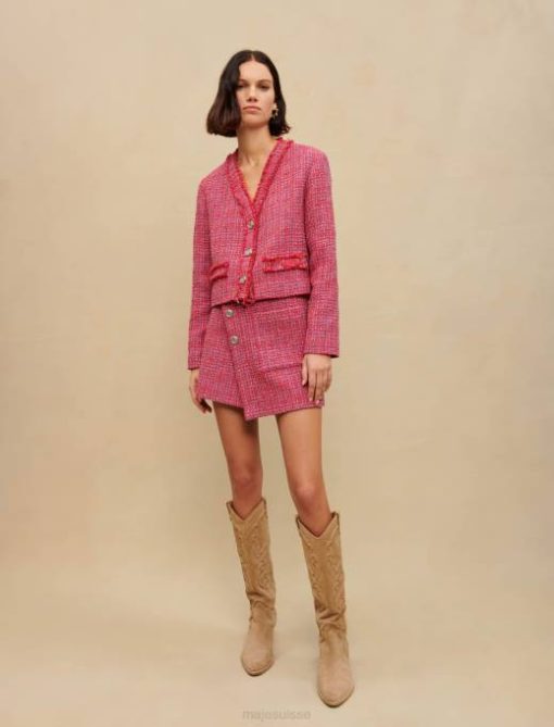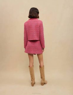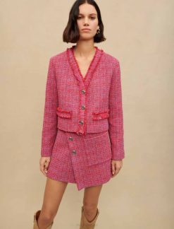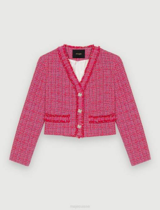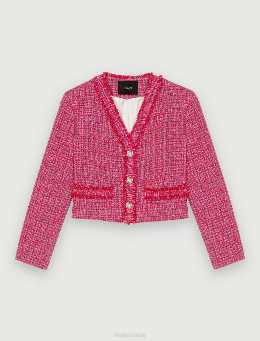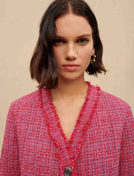une des pièces iconiques du vestiaire maje se décline en rose pétillant. le coloris de cette saison apporte fraîcheur et modernité à cette veste en tweed confectionnée dans un tissu italien. la veste a deux poches et est ornée de boutons élaborés et de bords bruts. portez-le avec la jupe assortie pour un total look tweed.