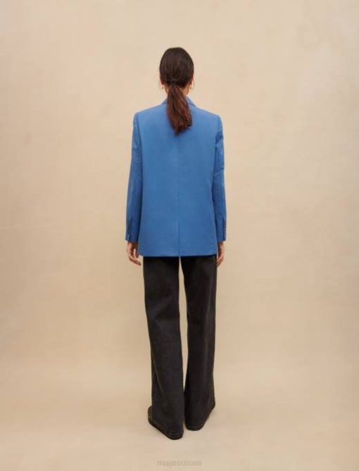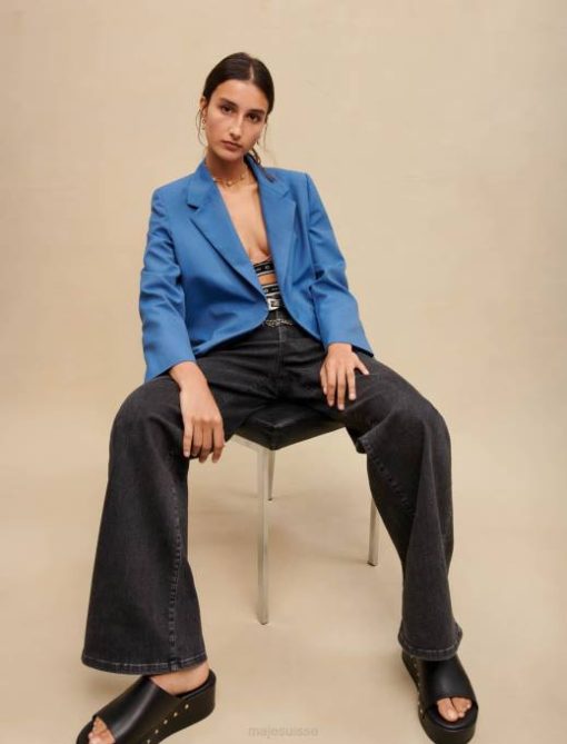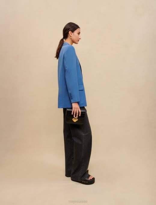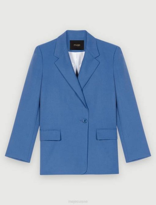 cette veste de tailleur bleue élégante et moderne est confectionnée dans un tissu contenant de la laine. il se ferme avec un bouton sur le devant. la doublure présente le logo maje trèfle. parfait pour une journée au bureau.