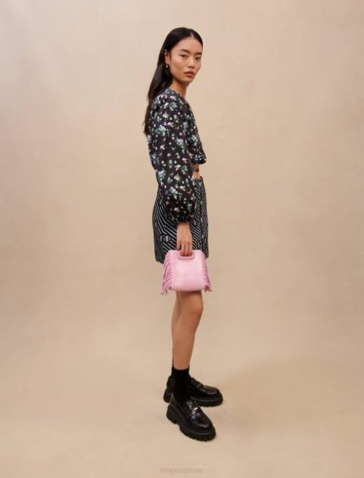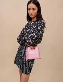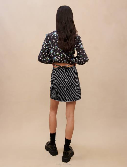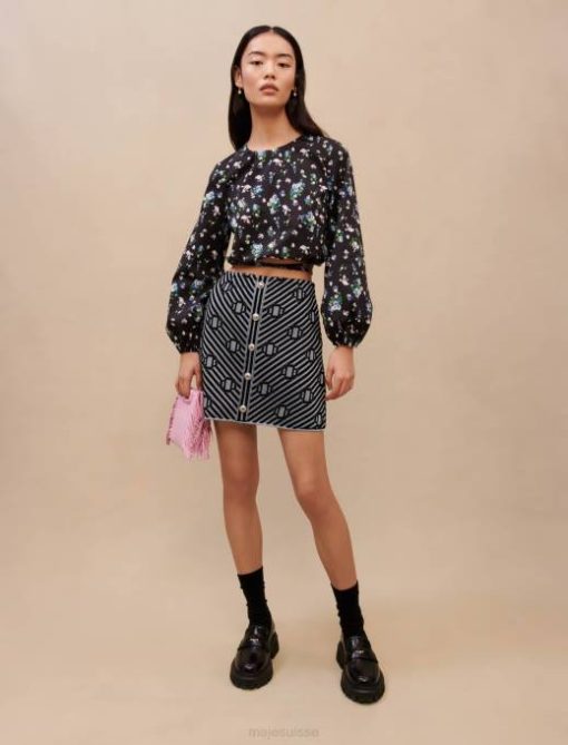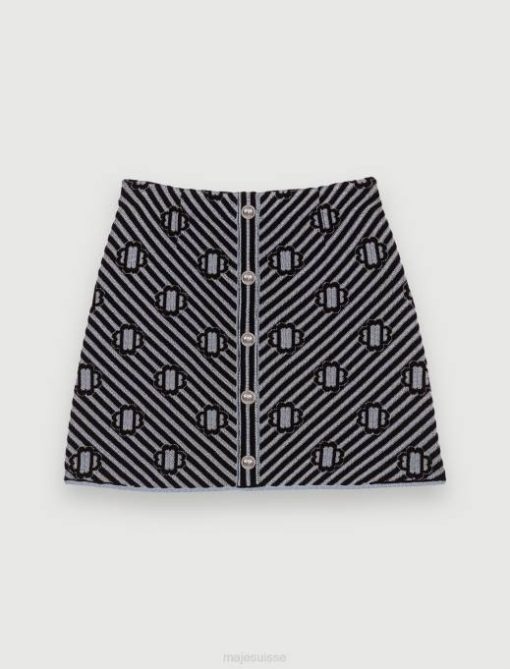 cette jupe en maille aux finitions légèrement métallisées adopte des imprimés graphiques trèfles Maje. sa coupe droite est structurée par des boutons sur le devant, entourés d’un liseré blanc.