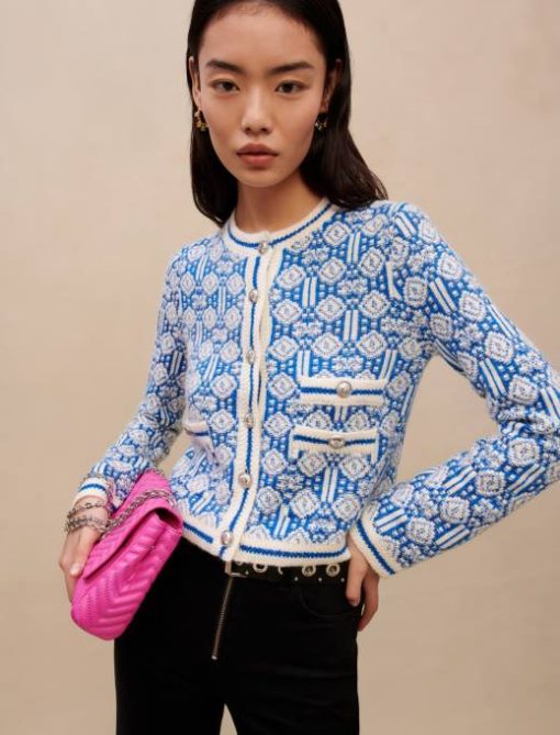 ce cardigan jacquard à la finition légèrement métallisée adopte un imprimé jacquard bleu ciel. il présente des boutons bijoux et trois poches sur le devant.