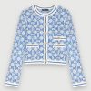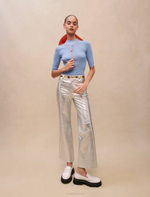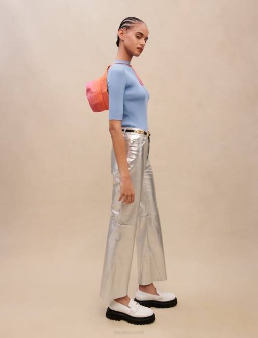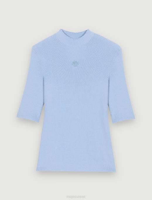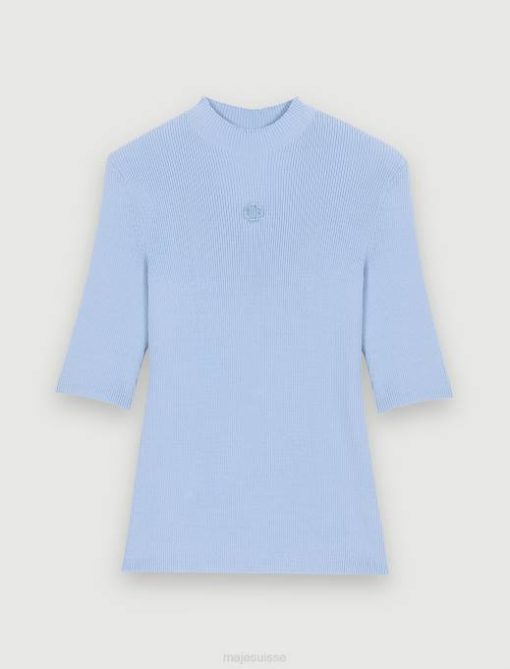 ce pull en maille côtelée bleu pastel présente un col montant et des demi-manches. sa coupe près du corps flattera votre silhouette et vous assurera une allure féminine tout en restant au chaud. broderie trèfle maje sur le devant.