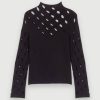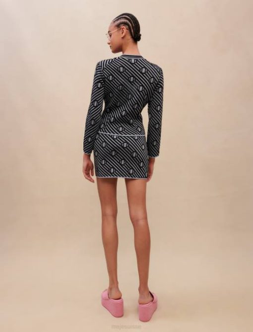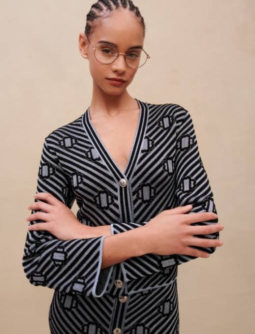 ce cardigan court en maille aux finitions légèrement métallisées présente des imprimés graphiques trèfles maje et deux poches sur le devant et se ferme avec de délicats boutons en nacre.