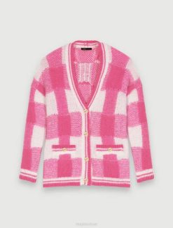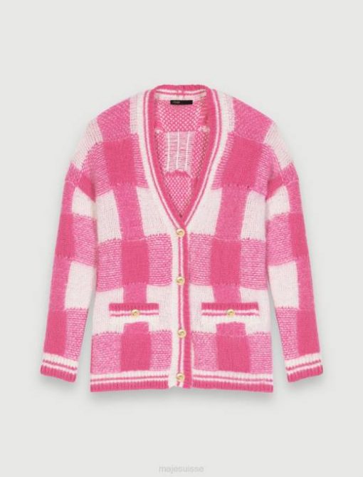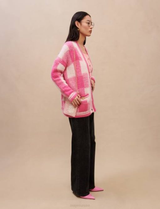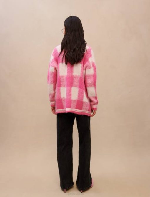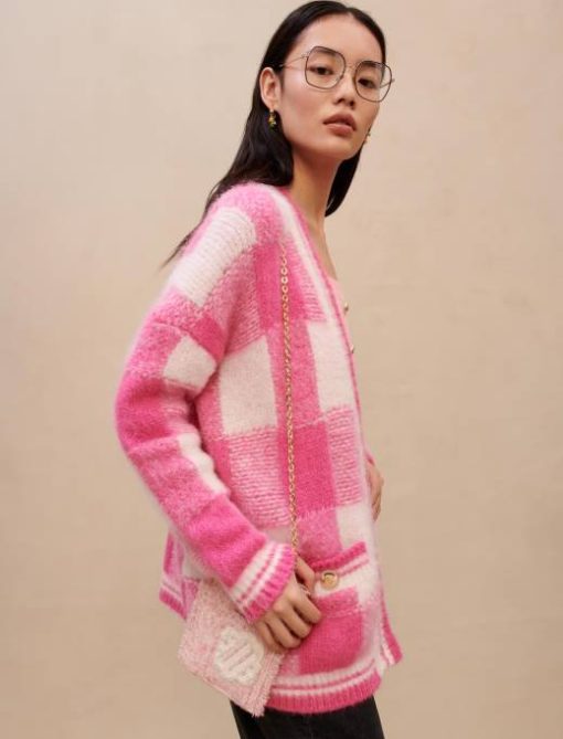ce cardigan en jacquard rose à carreaux présente un décolleté en V plongeant et des boutons délicats. il adopte cette saison une coupe oversize dans laquelle vous adorerez vous envelopper. il s’associera très bien avec le pantalon.