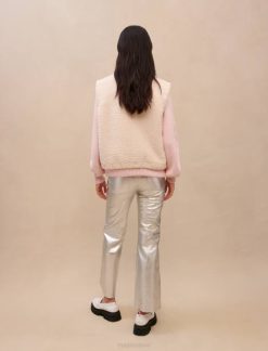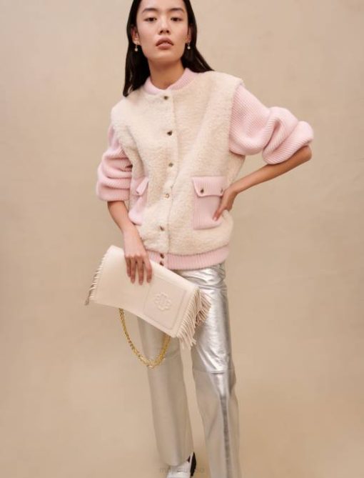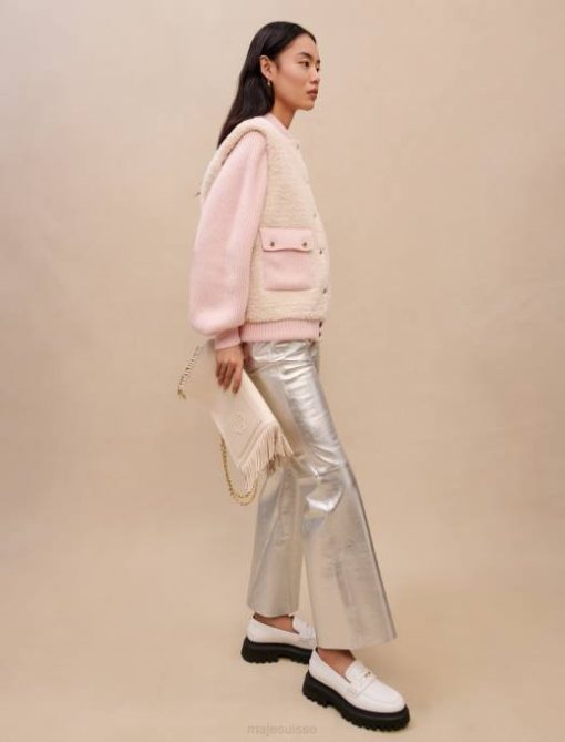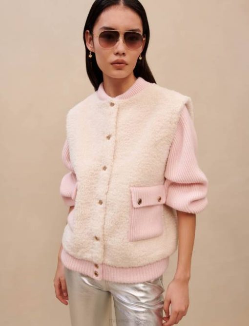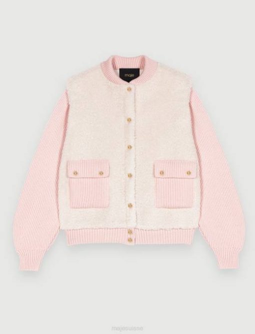 cette veste en fausse fourrure et mélange de matières en maille promet confort et style. sa maille côtelée rose et ses détails trèfles majes apportent une touche féminine fabuleuse. il se ferme par boutons pression.