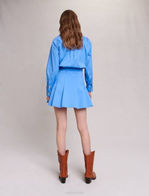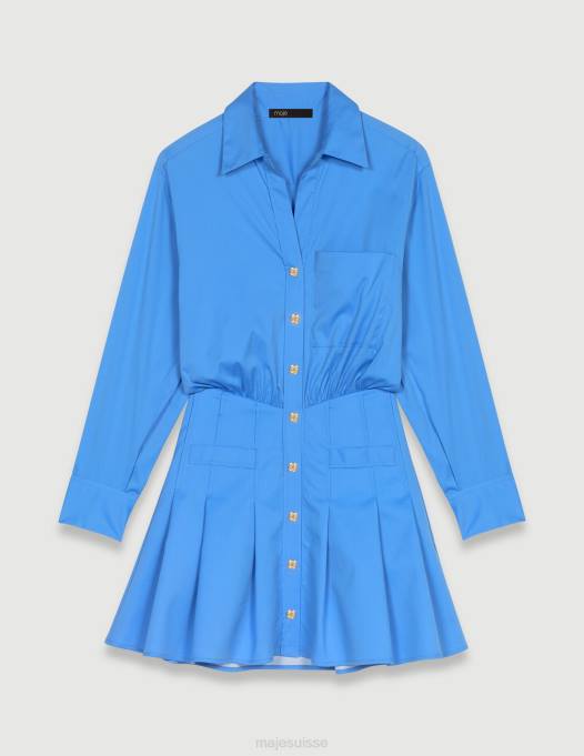 laissez-vous emporter dans un univers romantique aux subtiles inspirations british. la fille maje s’exprime avec un air poétique et crée des looks romantiques et preppy en mixant des pièces iconiques. Le bleu scolaire, couleur phare de la saison, est à l’honneur sur cette robe chemise courte en coton, créant une silhouette structurée. Doté d’une taille élastiquée au dos et de manches longues avec poignets boutonnés, il possède une poche poitrine plaquée et de fausses poches passepoilées. sa jupe plissée et évasée est ornée de boutons-pression en forme de trèfle doré et tombe parfaitement. Cette pièce s’accessoirise facilement avec des santiags, un sac effet métallisé et des bijoux.